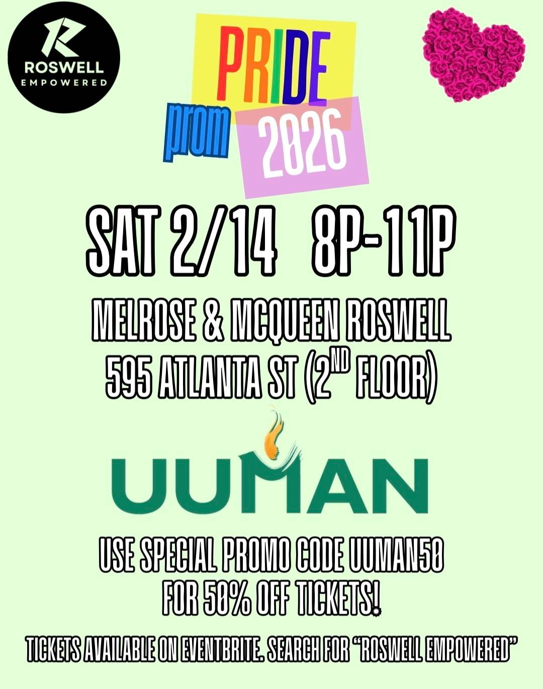 Join the Young Adult Group at Roswell Empowered's Pride Prom! We will be tabling on behalf of UUMAN throughout the night. The theme is Millenial Madness. Dress in traditional prom attire or as your favorite boy band member! Open beer/wine bar and light snacks provided. Use discount code UUMAN50 for 50% off tickets.